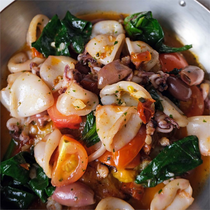Нежные кальмары лолиго, приготовленные в средиземноморском стиле с добавлением белого вина, шпината, томатов, оливок и чеснока. Подаются с картофельным гратеном