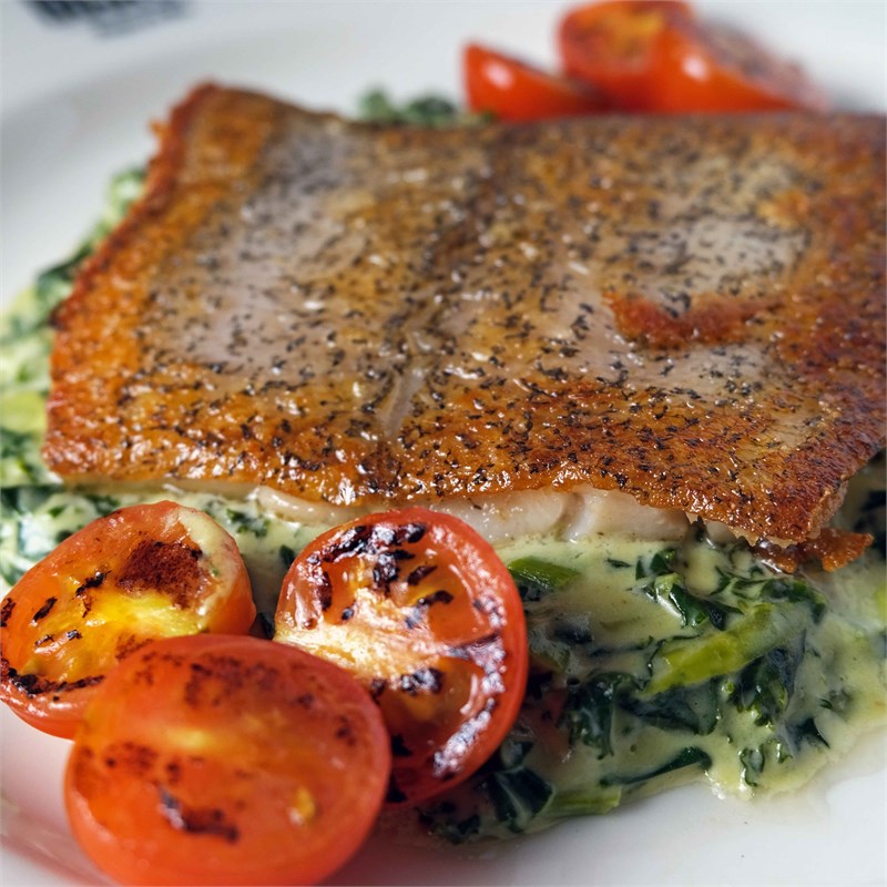 Филе палтуса обжаренное до хрустящей корочки на планче. Подаётся с гарниром из шпината, кейла и зеленого лука, припущенными в сливках с добавлением зеленого карри и помидоров черри