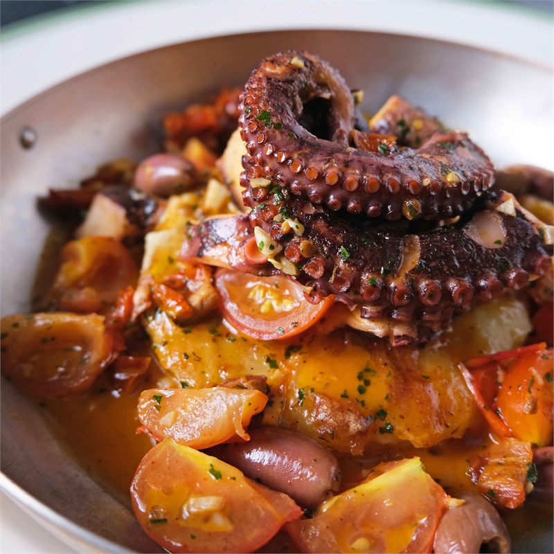 Жареный на планче осьминог с добавлением паприки, гарнируется нежным картофельным гратеном, томатами черри и оливками. Украшается рубленой зеленью