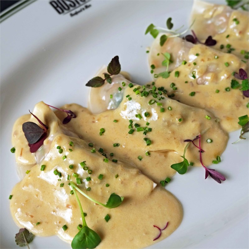 Равиоли с начинкой из мурманского лосося, пекинской капусты, зеленого лука, с добавлением чеснока и имбиря. Подаются в сливочном соусе с красным луком, сыром грана падано и понзу